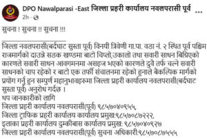 जिल्ला प्रहरी कार्यालय नवलपुरले सोमबार एक सूचना जारी गर्दै दाउन्ने हुँदै यात्रा नगर्न तथा कावासोती, डण्डा, चोरमारा, अरुणखोला लगायत क्षेत्रबाट वैकल्पिक मार्ग प्रयोग गर्न आग्रह गरेको छ । प्रहरीले यात्रु र सवारीलाई ती स्थानमै रोक्दै ‘होल्डिङ एरिया’ मा राख्न थालेको छ ।