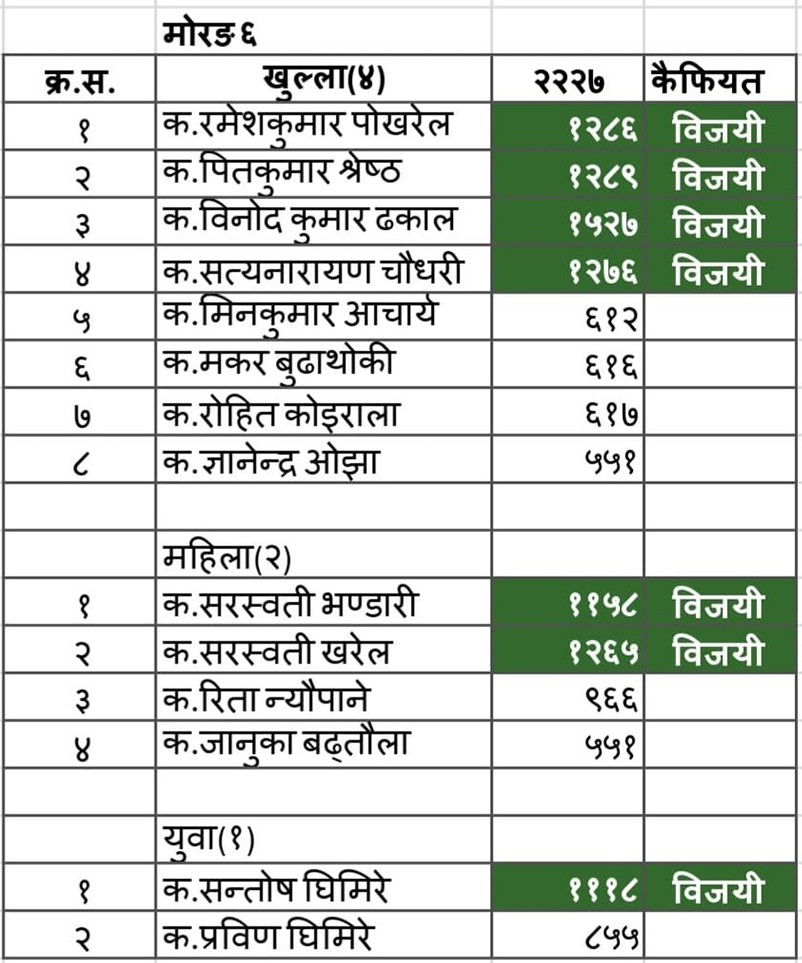 सार्वजनिक नतिजाअनुसार खुला, महिला र युवा तीनै क्लस्टरमा ढकाल पक्षका उम्मेदवार विजयी भएका छन् । खुला तर्फ ढकालसहित पितकुमार श्रेष्ठ (१,२८९), रमेशकुमार पोखरेल (१,२८६) र सत्यनारायण चौधरी (१,२७६) ले जित हासिल गरेका छन् ।